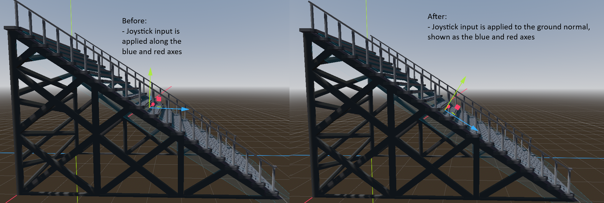 Grounded locomotion was updated so that the player's joystick movement was applied to the plane defined by the ground normal (right)