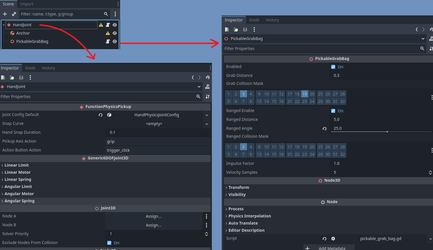 The PickableGrabBag contains all of the "selection" logic: identifying when an object is hovered by the hand, either via overlap radius or via a ranged grab. This script is a stripped down version of Godot XRTools' FunctionPickup.gd, refactored into a separate file to isolate selection logic from joint management logic.